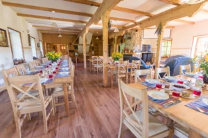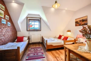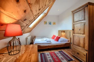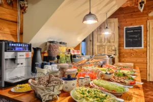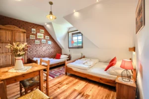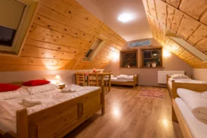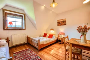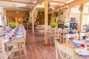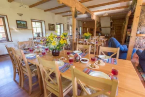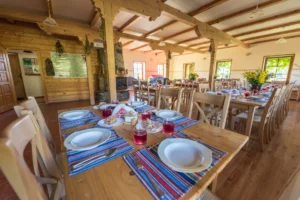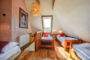 W Gościńcu Rabe czeka na Państwa klimatyczny pensjonat z dziesięcioma pokojami i nieco oddalona od niego chata z bali, którą również udostępniamy na wynajem. Niektórzy właśnie ją wybierają, by doświadczyć bardziej „dzikiego” noclegu w Bieszczadach – stąd do natury jest jeszcze bliżej.