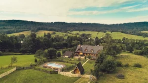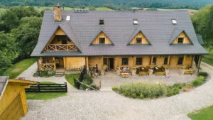 Pensjonat z dziesięcioma pokojami i nieco oddalona od niego chata z bali.