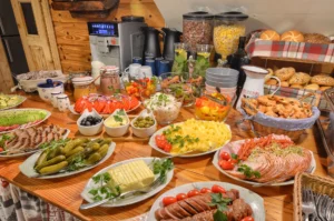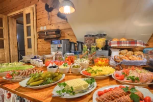 Obiadokolacja to dwudaniowy posiłek wydawany standardowo w formie bufetu. Pierwsze danie to pyszne, na miejscu przygotowywane zupy takie jak: klasyczny rosół, kwaśnica, uwielbiany krupnik, lokalny łewesz – czyli zupa z grochem i fasolą i wiele innych propozycji. Na drugie danie możesz spróbować regionalnych hryczanyków czyli kotlecików z mięsa i kaszy gryczanej w sosie grzybowym, knyszy z sosem czosnkowym oraz dań klasycznej polskiej kuchni.
